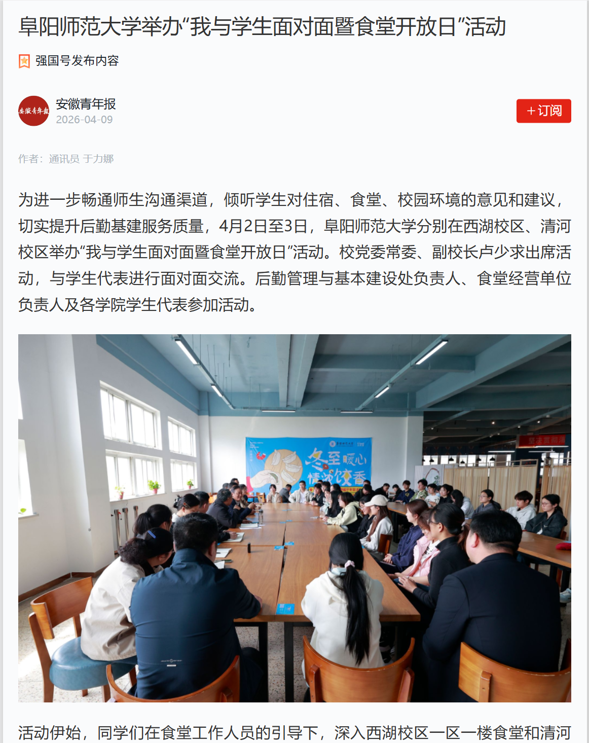 “学习强国”安徽青年报平台报道:阜阳师范大学举办“我与学生面对面暨食堂开放日”活动