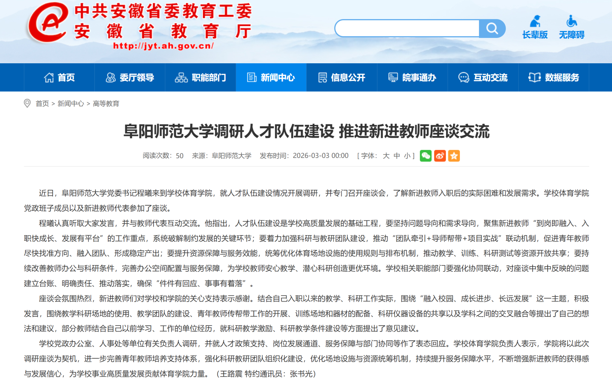 安徽教育网报道:阜阳师范大学调研人才队伍建设 推进新进教师座谈交流