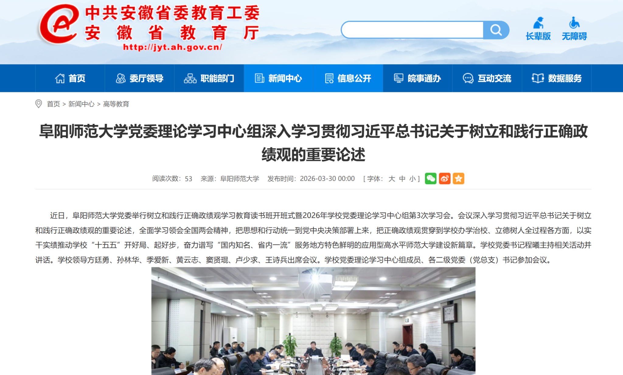 安徽教育网报道:阜阳师范大学党委理论学习中心组深入学习贯彻习近平总书记关于树立和践行正确政绩观的重要论述