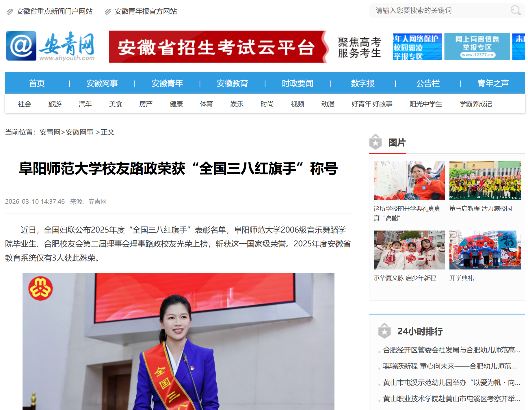 安青网报道:阜阳师范大学校友路政荣获“全国三八红旗手”称号
