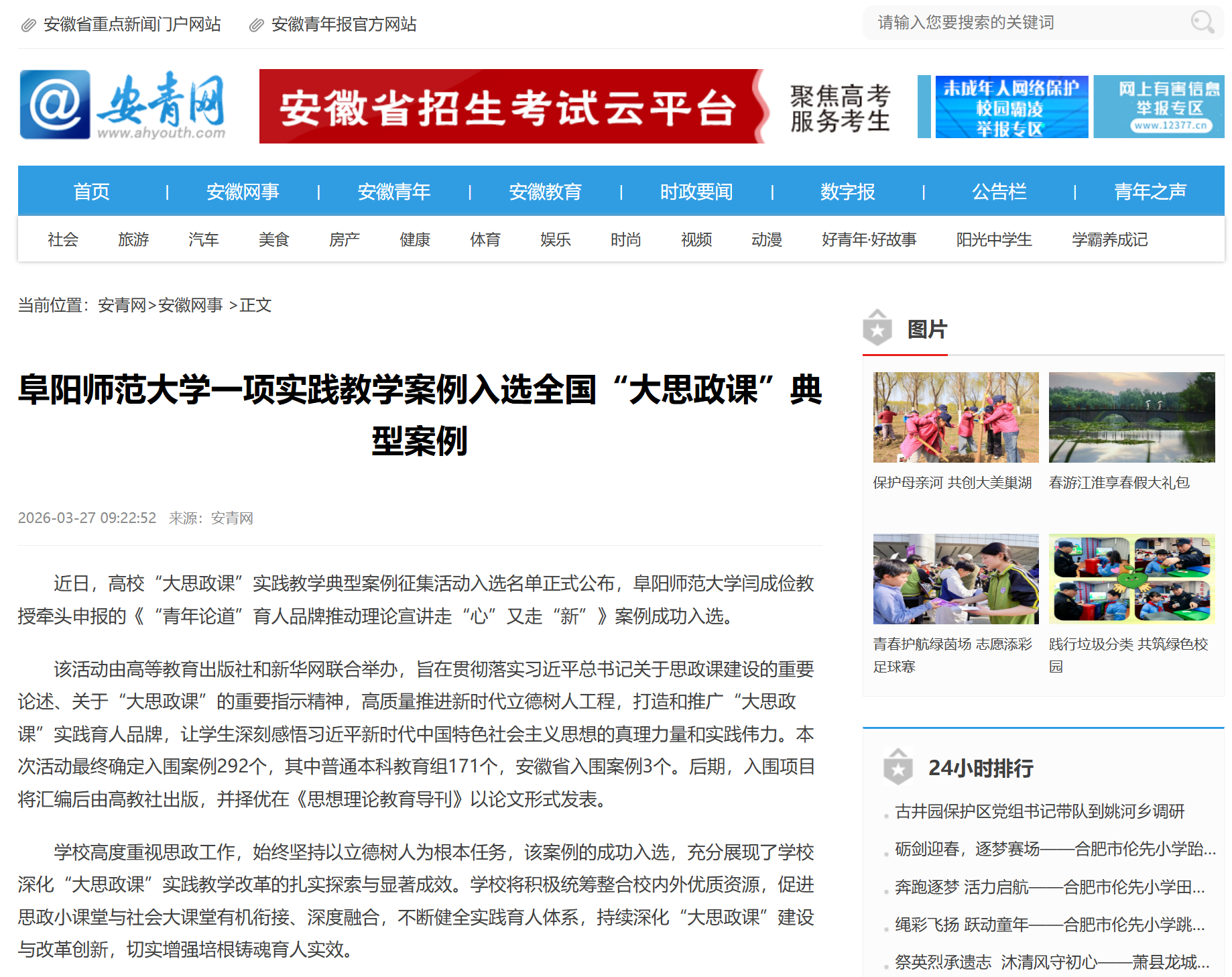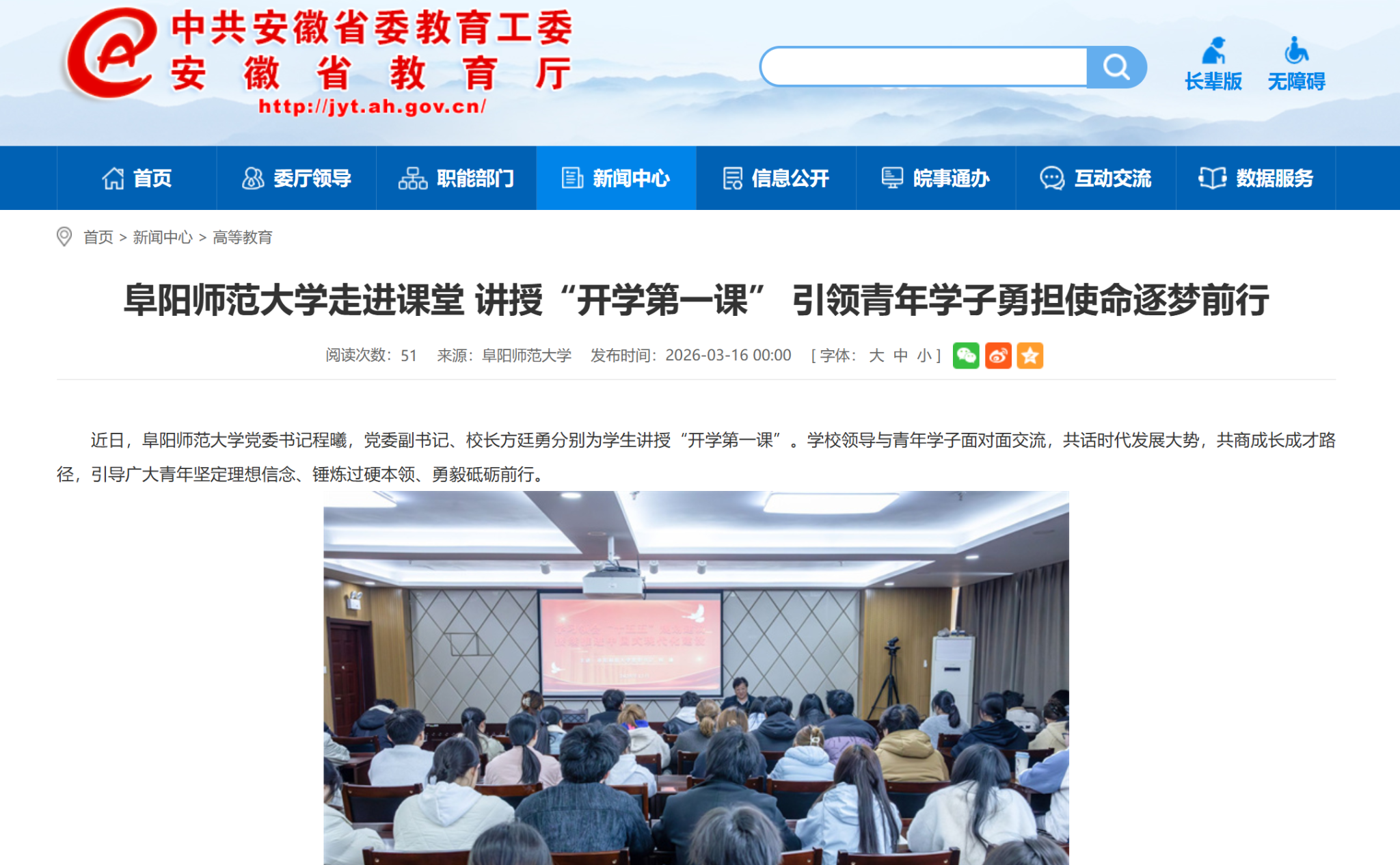 安徽教育网报道:阜阳师范大学走进课堂 讲授“开学第一课” 引领青年学子勇担使命逐梦前行