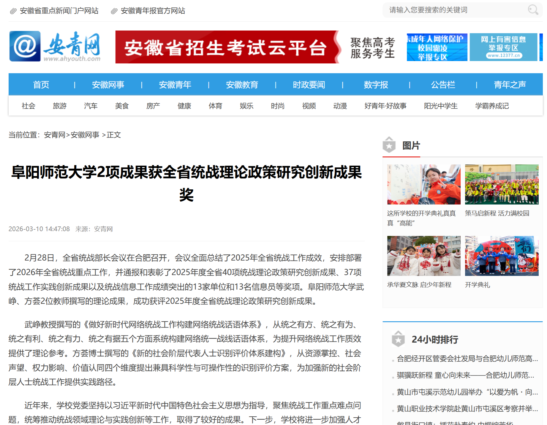 安青网报道:阜阳师范大学2项成果获全省统战理论政策研究创新成果奖
