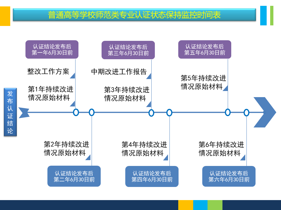 为督促已通过认证专业的持续改进工作,《监控办法》要求通过认证的所有专业逐年报备改进情况原始材料,认证机构将组织抽查。所有专业于通过认证第3年提交中期改进报告,认证机构及普通高等学校师范类专业认证专家委员会将组织开展中期审核。对未及时报备或提交报告,以及每年抽查和中期审核不通过专业,将依据《普通高等学校师范类专业认证实施办法(暂行)》及《监控办法》,中止认证有效期。