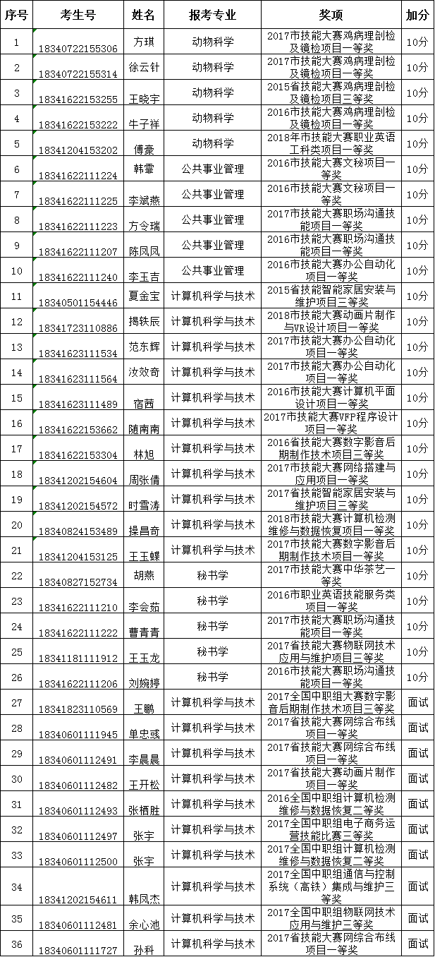 根据《阜阳师范学院2018年面向中职毕业生对口招生章程》,经本人申请,毕业学校及所在市教育局审核,方琪等26名考生符合对口招生加分政策,王鹏等10名考生符合免试入学面试政策,现公示如下: