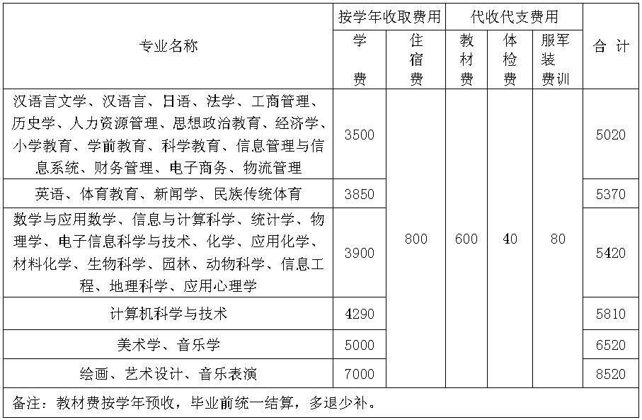 学校按规定收取相关费用。新生分专业缴费标准详见下表: