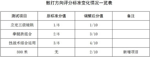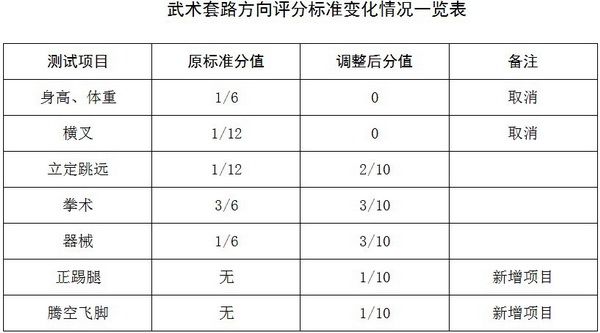 根据国家体育总局的有关通知精神,2011年民族传统体育单招评分标准有部分变化,结合我校实际,现将评分标准重大变化项目列举如下,具体评分细则请详见文后链接: