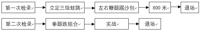 800米、立定三级蛙跳、拳腿跌组合、左右鞭腿踢沙包、实战 |