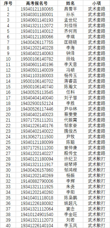 根据我校《2019年武术与民族传统体育专业招生简章》,经民族传统体育专业单独招生考试工作领导小组研究,2019年民族传统体育专业拟录取以下40名考生,现予公示。