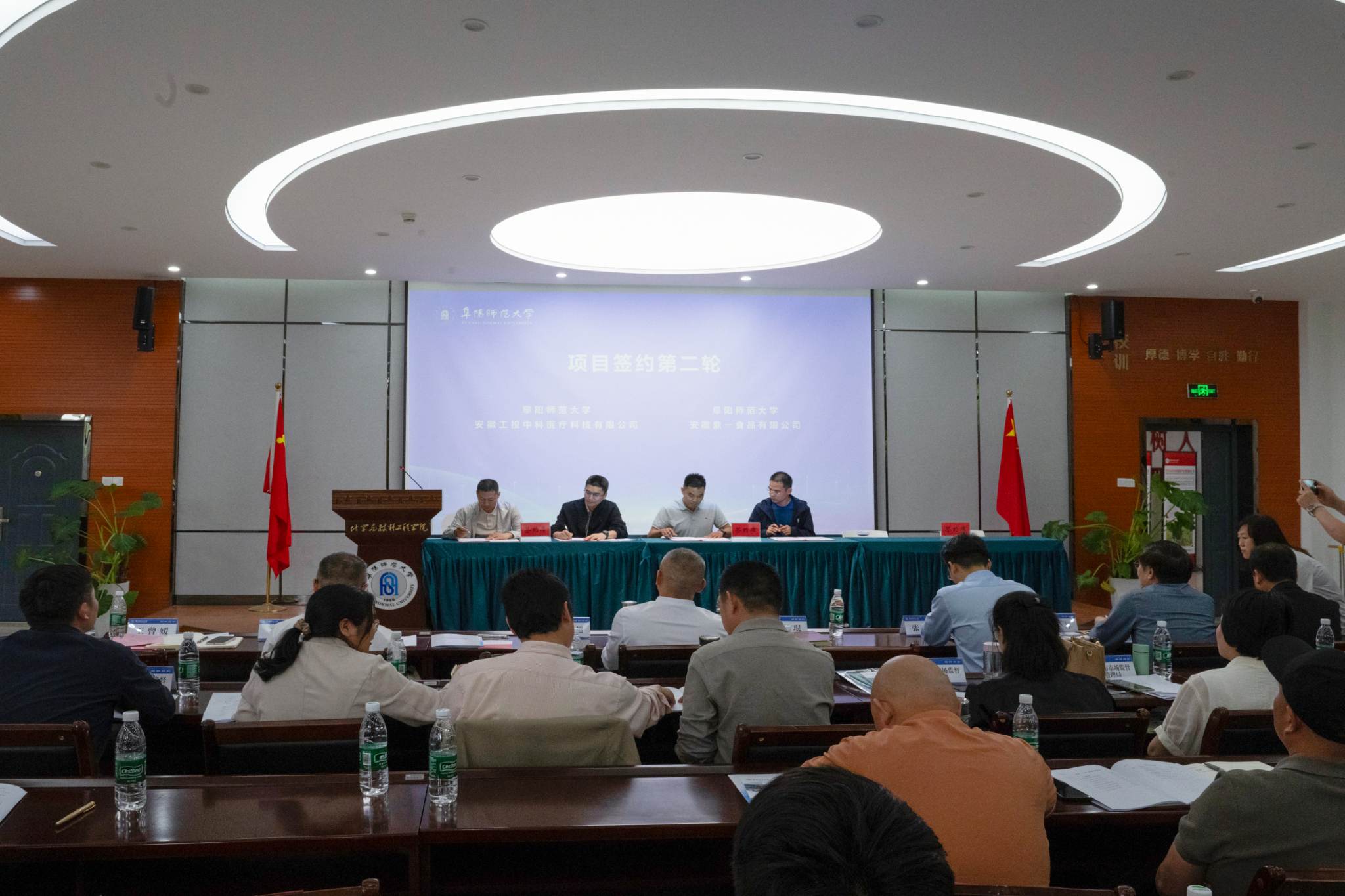 活动现场,我校还与安徽绿佳信息科技有限公司、安徽禾美环保集团、杭摩科技新材料(阜阳)有限公司、安徽工投中科医疗科技有限公司以及安徽鼎一食品有限公司等企业举行了签约仪式。