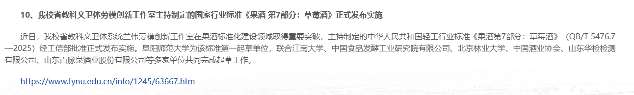 近日,阜阳师范大学2025年度十大新闻评选结果出炉,我校省教科文卫体系统兰伟劳模创新工作室(挂靠我中心建设)主持制定的轻工行业标准《果酒 第7部分:草莓酒》(QB/T 5476.7—2025)成功入选。