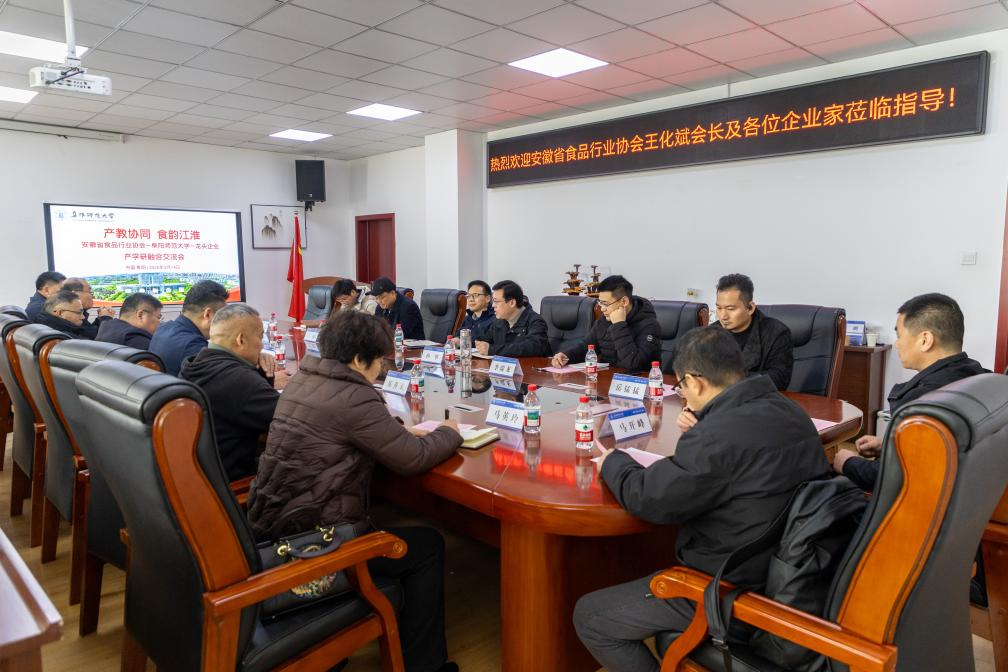 2026年3月14日上午,以“产教协同 食韵江淮”为主题的产学研融合交流会在阜阳师范大学生物与食品工程学院举行。安徽省食品行业协会专职副会长王化斌,南京涡阳商会会长刘森,合肥欧力杰智能装备系统有限公司董事长陈国军,安徽国口酒业股份有限公司副总经理郜建、马英玲,安徽涡阳酿酒厂总经理岳善玉,安徽王仁和酒业有限公司副总经理李伟等协会、商会和企业代表参会。阜阳师范大学科研处副处长于立志,生物与食品工程学院党委书记孙华,以及安徽省功能性果饮生态发酵工程研究中心主任兰伟及团队李瑞龙博士、颜承海博士等出席会议。会议由兰伟研究员主持。