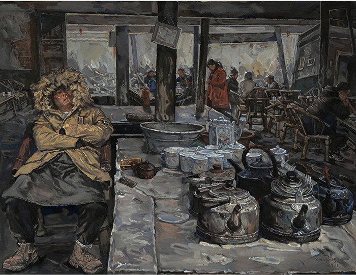 李向兵水彩画作品《茶馆·六》画面构图别致、造型厚重、色彩沉稳,情调亲和而温馨。尤其是敦厚朴拙、概括凝练的笔触,以及画面中主体的黄灰与后面点缀的红灰色使画面的低短灰调呈现出一种来自于大地般的厚重朴拙的自然之力,生动耐看。灶台上紫砂壶、打火机和香烟的塑造让画面的生活气息更为浓烈。整个画面的艺术表现轻松随意,充分反映了作者对文化一体化进程中日益消失的民间传统生活方式的关注。茶馆”系列作品也是李向兵在2019年国家艺术基金青年艺术创作人才项目《茶馆·人生》顺利结题后对这一创作主题的再深入研究。