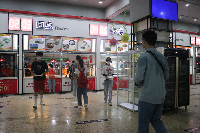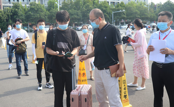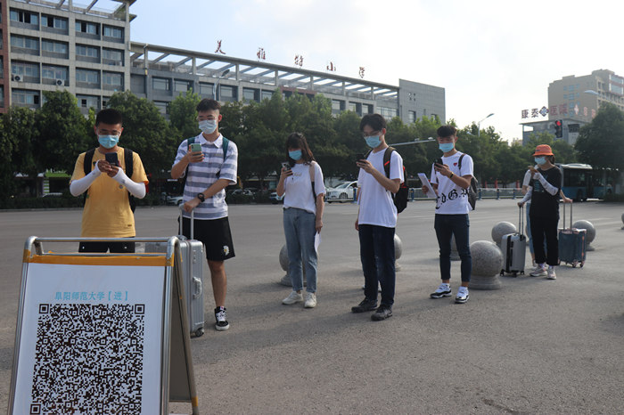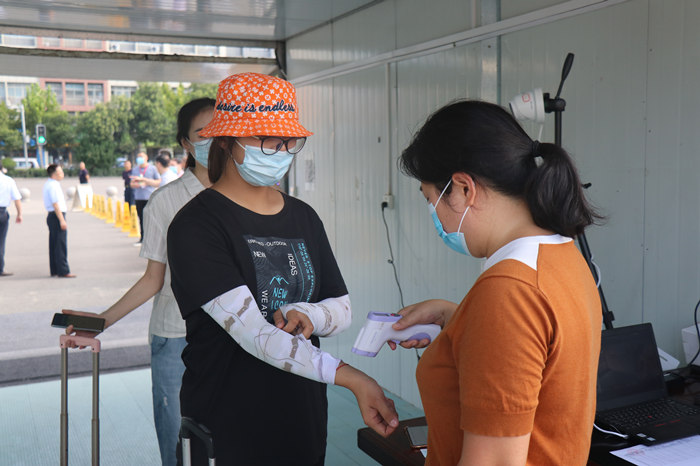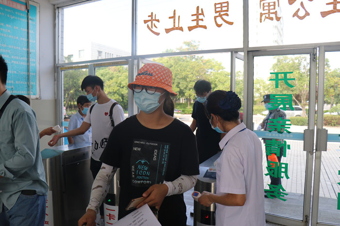 启动仪式结束后,“返校学生”按照既定的流程进行返校模拟演练。在学校北大门口,“返校学生”前后间隔一米有序排开,出示安康码或其他健康证明并接受行李物品消毒,健康码通过的“返校学生”出示相关证件进行身份核验,经体温检测正常后进入学校。进校后,她们来到学院报到处,递交《返校行程信息登记表》《返校申请表》、签署《健康状况精准摸排登记表》《学生健康承诺书》,再前往所居住的宿舍区,经行李消杀和体温检测正常后进入宿舍,完成返校报到流程。演练中,还模拟了在食堂就餐的场景和突发应急情况的处置。