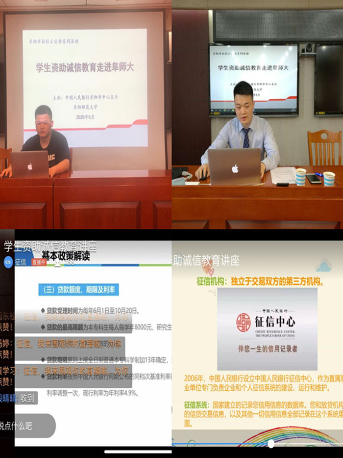 为深入宣传国家助学贷款及资助政策,普及征信及信用知识,进一步提高学生诚信意识,培育诚信品质,5月15日下午,由校学生工作处主办、商学院承办的2020年学生资助诚信教育“云宣讲”活动通过钉钉平台直播的方式顺利举行。中国人民银行阜阳市中心支行征信管理科裘德智、颍泉农村商业银行客户经理高杨应邀作专题报告。我校各学院资助负责老师和1000余名毕业年级助学贷款学生参加此次宣讲活动。