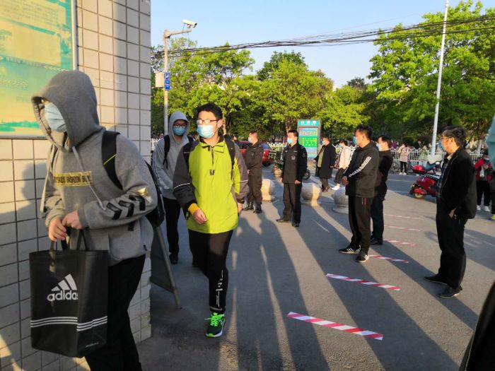 2020年4月13日的清晨与以往不同,这天是初三复学的第一天,阜阳师范大学第二附属中学西门口,全体学校领导带着值班老师们在指挥学生一一进入校园,学校门口设置了红外体温监测点,缓冲区域划定清晰标线,500多名学生有序排队入校,不聚集、不滞留。持续近两个月的网络课堂也正式“搬回”了校园。