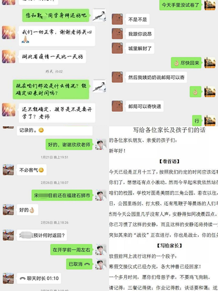 班主任们通过发送宣传资料、打电话、手写长信等方式,向滞留外地学生和家长宣传普及疫情防控知识和防控要求;对滞留学生进行心理疏导;一对一进行政策宣传,教育引导学生和家长配合当地疫情防控工作;同时还利用校园和班级平台、个人空间、微信群、QQ以及自己开发的小程序等积极发声,对孩子进行爱国、生命、科学、健康等教育。