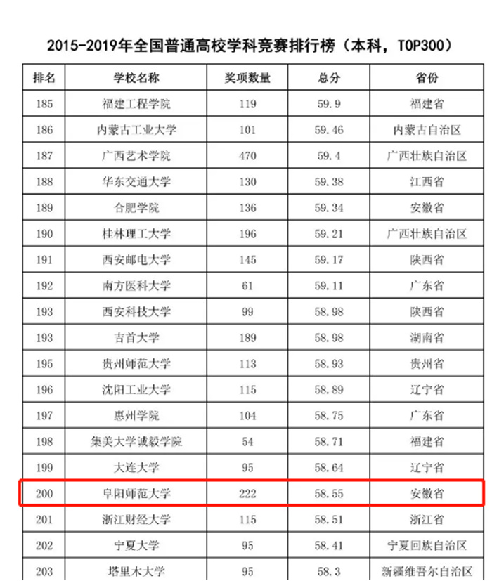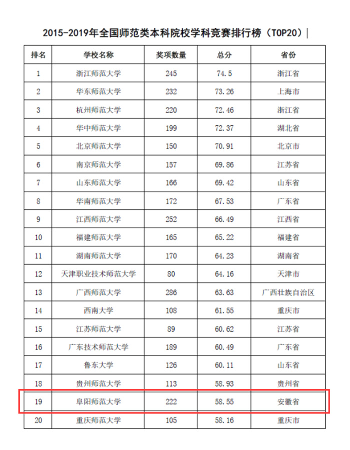 2月22日,中国高等教育学会对外发布了2015-2019年全国普通高校学科竞赛排行结果,我校继续榜上有名。在全国普通高校竞赛评估结果(本科TOP300)中位居第200名,在安徽省入围的12所本科院校中排名第9位,师范类院校中排名第1,并成为安徽省唯一一所入围全国师范类本科院校学科竞赛排行榜(TOP20)的本科师范院校。