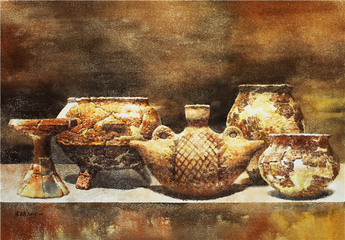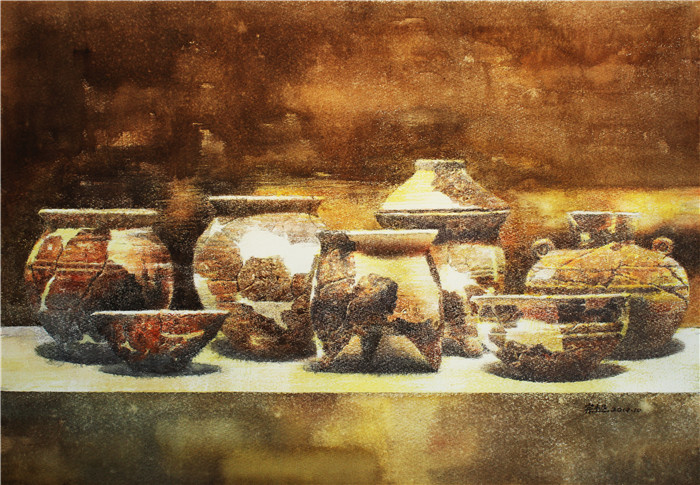 庞宗超此次参展的三幅作品均为近期创作,以水性综合材料与技法表现中国文化的辉煌代表——历经数千年而愈加璀璨的远古陶器。画面用色浓重、造型厚实、充满视觉张力,丰富耐看的肌理、细腻微妙的色彩、别有意味的形式使作品呈现出别具一格的视觉效果。