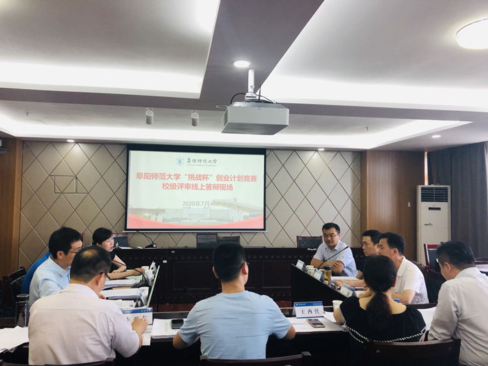 我校第十二届“挑战杯”大学生创业计划竞赛视频答辩会于7月22日在正行楼1302会议室召开。阜阳市科协科普部副部长赵雷,阜阳技师学院高级讲师、国家级创业培训师王西侠,君信企业管理咨询有限公司总经理李金袖,阜阳一中科创中心主任李亚东和我校招生就业处处长方强、文学院党委书记陈旭阳、研究生处副处长牛向阳、评建办副主任李欢担任评委,校团委副书记刘晓娟、任竹良出席会议。视频答辩会由任竹良主持。