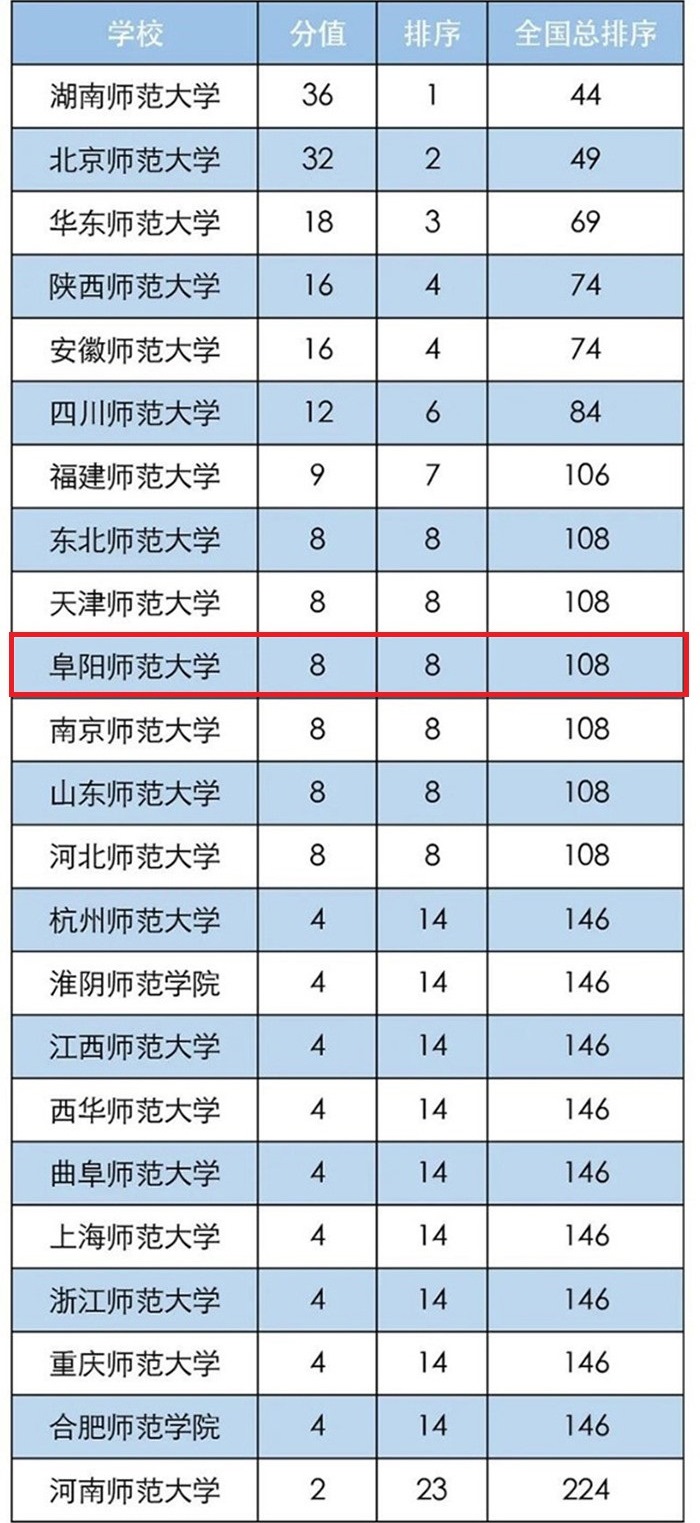 此排行榜通过对中国院士馆官网、院士所在学校和相关单位官网上的数据进行统计,并对院士成长历史轨迹进行详细梳理,对各校贡献予以赋值,本科求学一年赋值1分,使院校本科教育的贡献和特征都能得以认可和凸显。榜单显示,阜阳师范大学位列安徽省师范类院校第2位、全国师范类院校第8位,全国高校第108位。