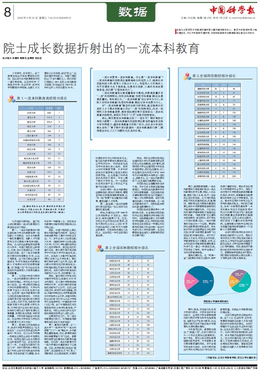 中国科学报以自然科学、工程技术科学、农业科学、医学科学和管理科学领域的中国科学院院士、中国工程院院士(不含外籍院士)为依据,时间起点是1949年(本科毕业年),时间跨度约70年,梳理分析了1065位院士的本科院校数据,形成了“基于院士成长数据的一流本科教育排行榜”。
