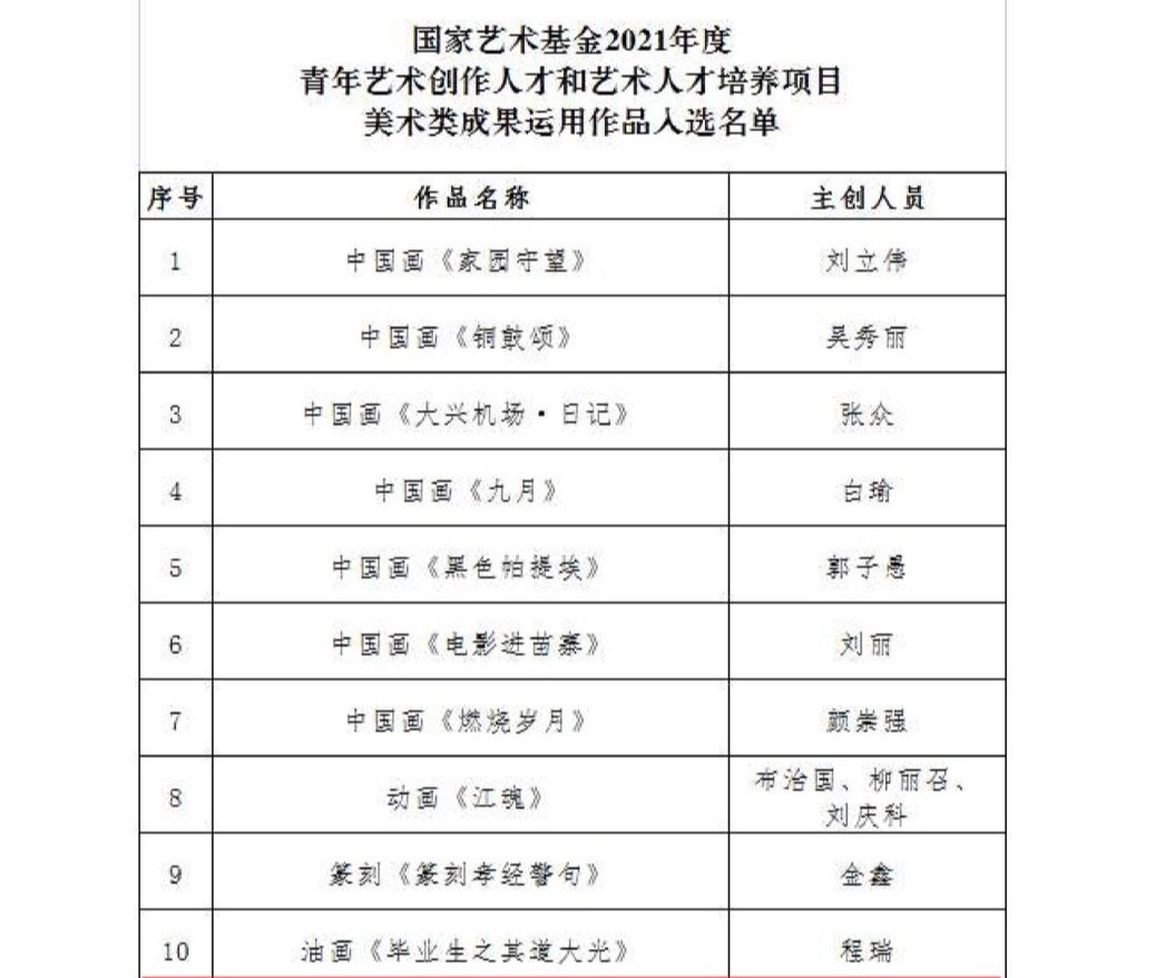 近日,国家艺术基金官网公布了“国家艺术基金2021年度青年艺术创作人才和艺术人才培养项目美术类成果运用作品入选名单“。我校美术学院程瑞副教授主持并已经完成结项的2019年度国家艺术基金青年艺术创作人才资助项目成果——油画创作《毕业生之其道大光》成功入选。