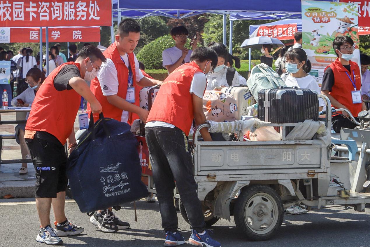 面对这些,2021级思想政治教育4班的穆迅感受到了家一般的温暖,“老师和学长们让我们深切地体会到了学校是一个团结友爱的大集体。她们顶着烈日帮我把行李一路搬到了寝室里。她们辛苦了!”