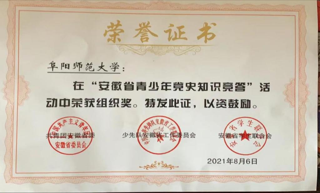 为庆祝中国共产党成立100周年,引导全省广大青少年厚植爱党、爱国、爱社会主义的情感,由共青团安徽省委、少先队安徽省工作委员会、安徽省学生联合会共同主办了安徽省青少年党史知识竞答活动圆满结束。我校被授予“组织奖”称号。
