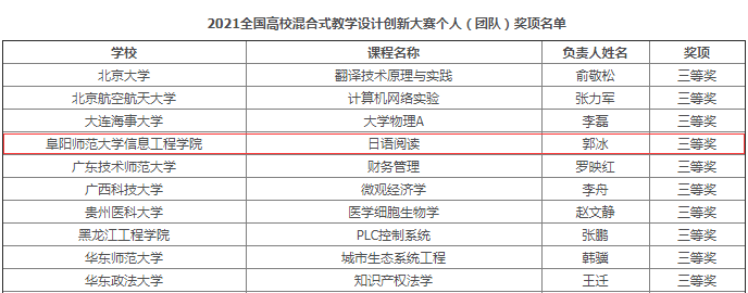 11月11日,“第三届全国高校混合式教学设计创新大赛”复赛结果公布,我校首次组织教师参加比赛,信息工程学院郭冰老师的参赛课程《日语阅读》获得全国三等奖,计算机与信息工程学院王亚、经济学院李晓炫、文学院杜红梅和信息工程学院杨冰清等4位教师参赛课程获优胜奖。