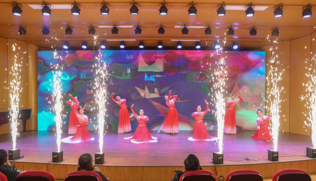 庆典第二阶段,“阜阳师范大学附属小学建校40周年文艺汇演”在喜气洋洋、朝气蓬勃的学生民乐合奏《金蛇狂舞》《凤阳花鼓》中开始,附小女教师带来舞蹈《教师颂》,她们用自己柔美的舞姿表达着对教师的敬意与对学校的热爱。