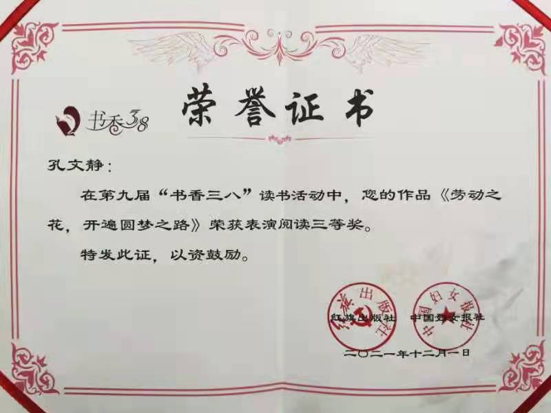 近日,由红旗出版社、中国妇女报社联合举办的全国第九届“书香三八”读书活动评选结果公布,我校共有2件女职工作品获奖。其中,法学院孔文静老师的演讲作品《劳动之花开遍圆梦之路》获表演阅读类三等奖,马克思主义学院宁小双老师的演讲作品《赓续精神血脉鉴往已知未来》获表演阅读类优秀奖。