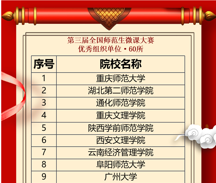 近日,2021年第三届全国师范生微课大赛获奖名单公布,我校获特等奖3项、一等奖5项、二等奖4项、三等级5项,优秀指导教师3位,并荣获优秀组织奖1项。