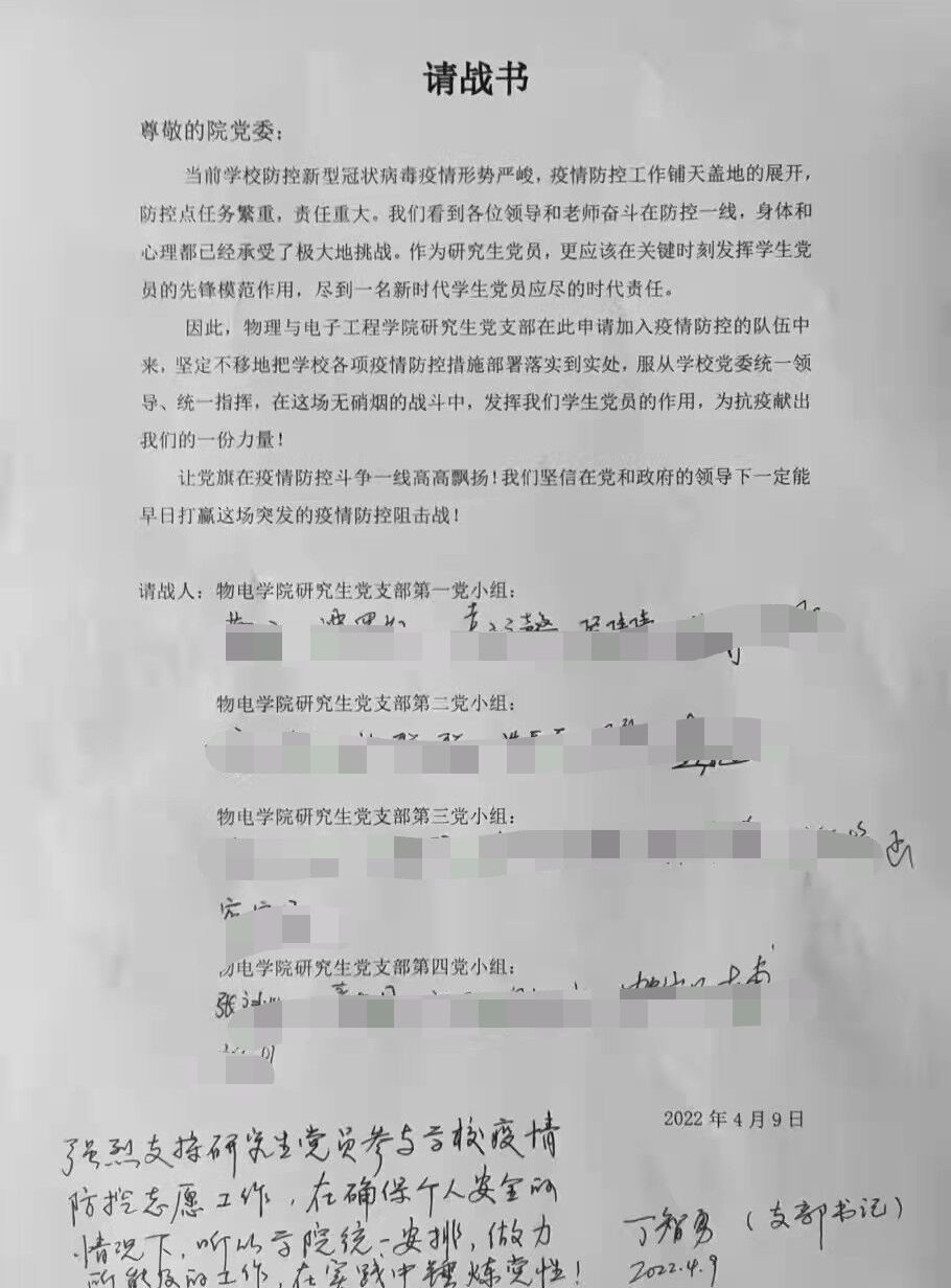 “作为研究生党员,更应该在关键时刻发挥学生党员的先锋模范作用,尽到一名新时代学生党员的时代责任。”“服从学校党委统一领导,在这场无硝烟的战斗中,发挥学生党员的作用,为抗疫献出我们的一份力量。”这些铿锵有力、充满斗志的话语来自我校不畏风险、勇于担当的研究生党员的抗疫“请战书”中。
