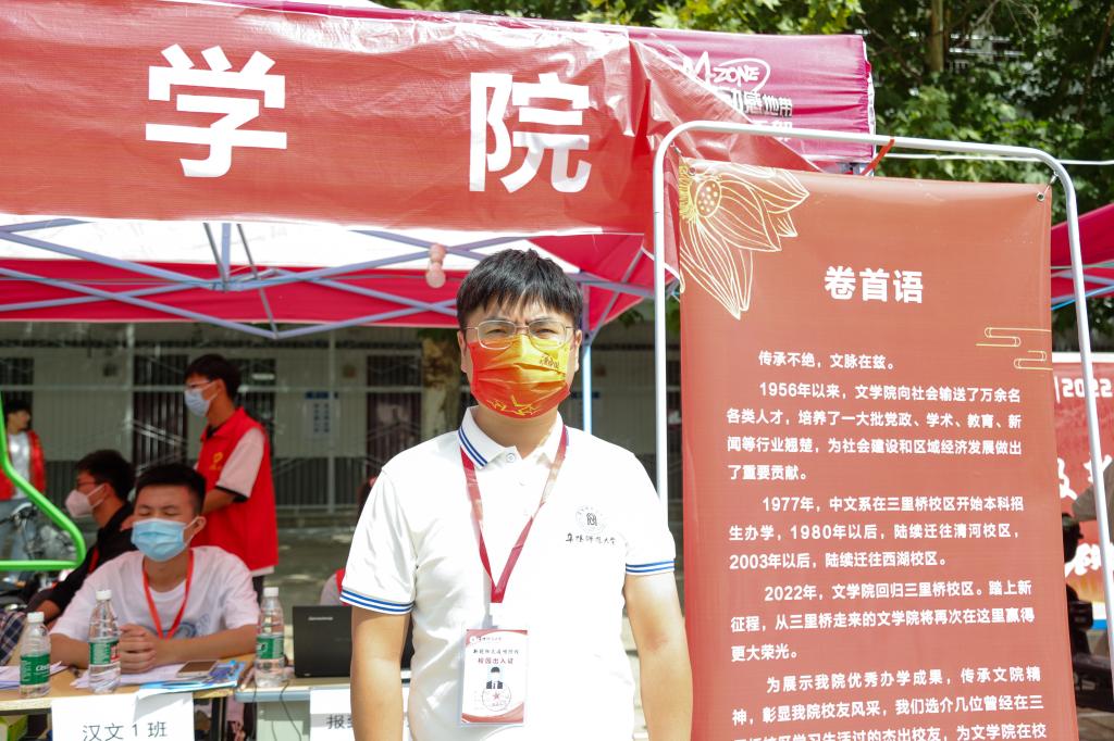 当带有文学院特色的帆布袋被发放到新生手中时,文学院新生辅导员王洋说:“帆布袋是文院的缩影,而三里桥校区是文学院的发迹点,曾经一批批优秀校友从这里走出去,今年2022级的文学院新生来到阜师大三里桥校区报到,也算是文学院归根,完成一脉相传。”文学院迎新点还放置了优秀毕业生立牌,借此激励新生传承阜师大“厚德、博学、自胜、勤行”的校训。