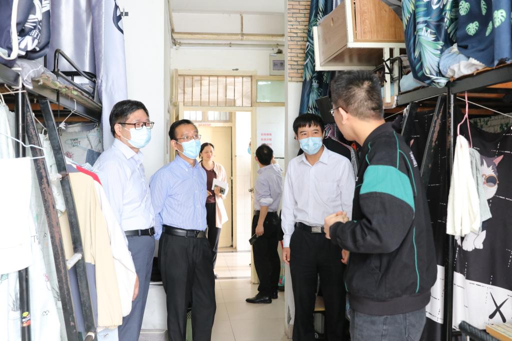 张庆旭、季爱新走进学生公寓,与学生交谈,询问同学们对目前阜阳地区疫情防控情况是否了解,对学校的疫情防控管理有什么建议,能否适应现在的校园管理模式,并鼓励同学们要积极、乐观、主动地投入到学习生活中去。