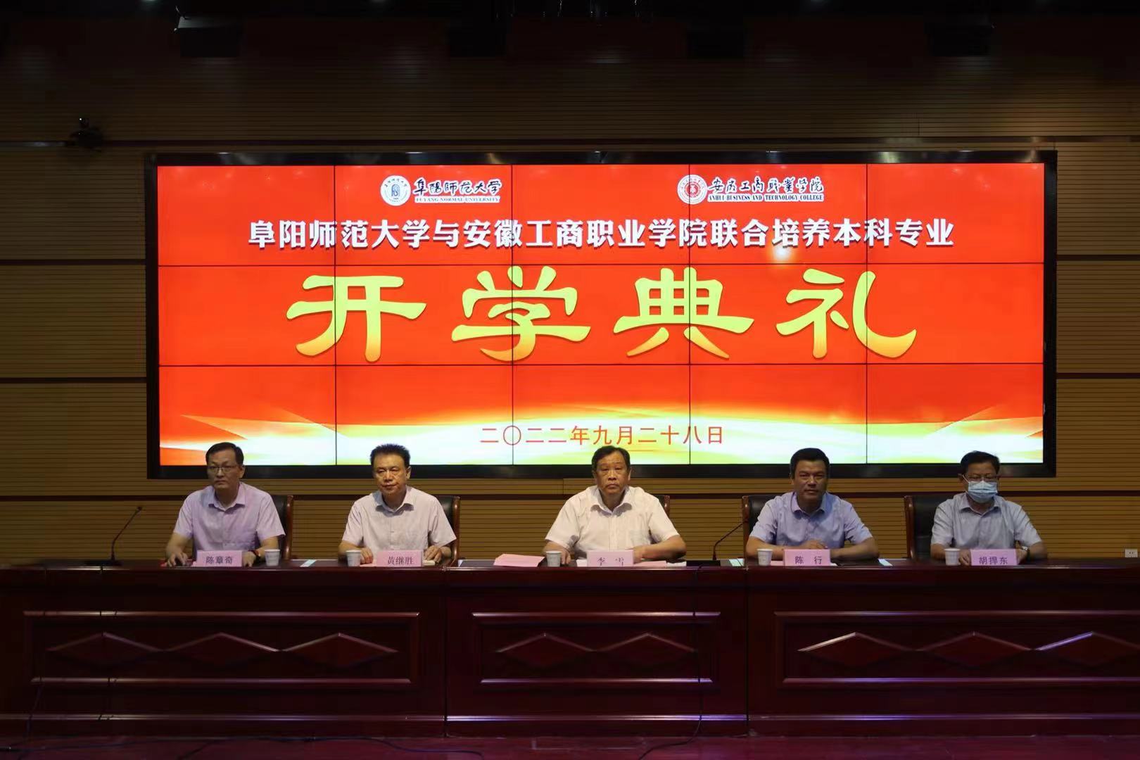 安徽工商职业学院党委副书记、院长李雪指出,高职院校和本科院校联合培养人才,是国家深入实施职业教育改革、建设现代职业教育体系的重大战略决策,安徽工商职业学院与阜阳师范大学高起点谋划,高标准落实,取得了联合培养本科层次人才的阶段性成果,对探索全新人才培养模式提供重要机遇。他希望,同学们继续保持在专科阶段刻苦钻研和勤奋好学的昂扬之势,确定新的人生目标,尽快适应本科阶段的学习和生活,倾情擘画美好未来,不负青春,不负韶华,增强做中国人的志气、骨气、底气,努力成长为国家和民族的栋梁之才。