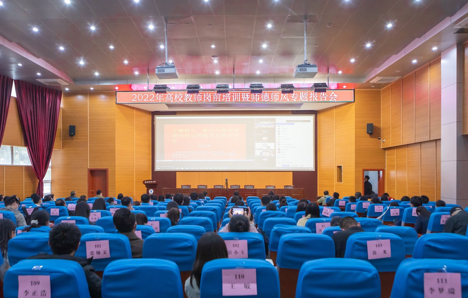 为深入学习贯彻党的二十大精神,持续推进我校师德师风建设,11月9日下午,我校在西湖校区躬行楼F楼报告厅举行2022年高校教师岗前培训暨师德师风专题报告会,各二级党委(党总支)通过腾讯会议同步收看报告会直播。