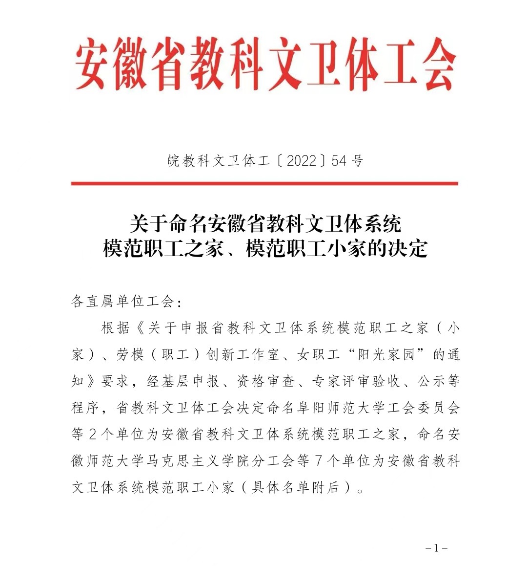 据悉,本次模范职工之家和小家评选,省属高校广泛参与,经基层申报、资格审查、专家评审验收、公示等程序,省教科文卫体工会决定命名阜阳师范大学工会委员会等2个单位为安徽省教科文卫体系统模范职工之家,命名安徽师范大学马克思主义学院分工会等7个单位为安徽省教科文卫体系统模范职工小家。