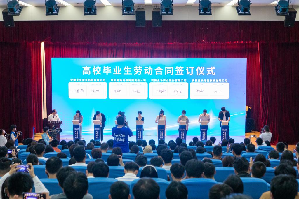 宣讲会上,与会人员共同观看了阜阳市情宣传片和阜阳市开展校园招聘活动总结视频;见证了企业与达成意向毕业生现场签订劳动合同激动时刻;阜阳土著网络科技有限公司孟凡帆、安徽田园居公司李庆洪分享了在阜创业就业经历和感悟。