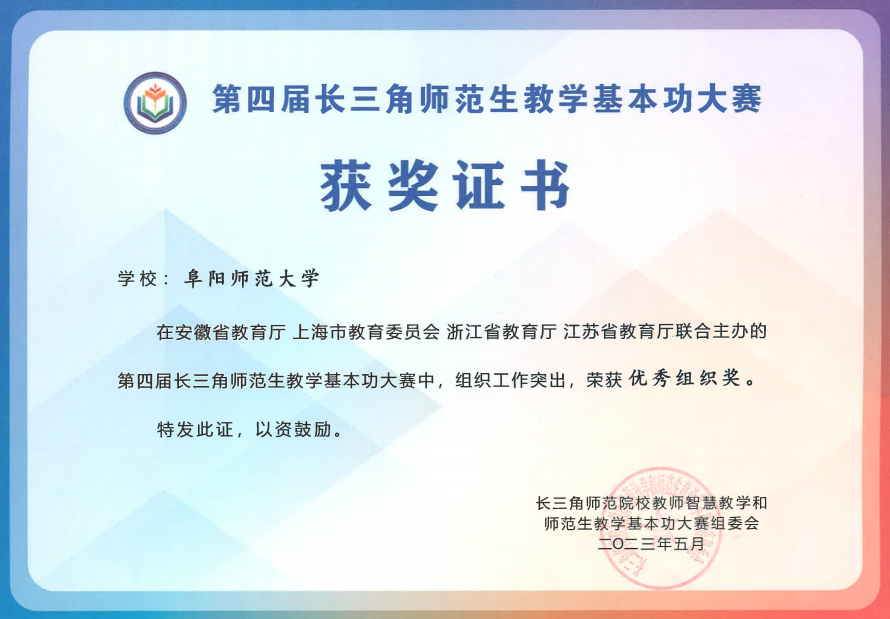 日前,第四届长三角师范生教学基本功大赛圆满落幕,我校学子共获一等奖2项、二等奖3项、三等奖3项,学校获优秀组织奖1项、优秀工作者1项。