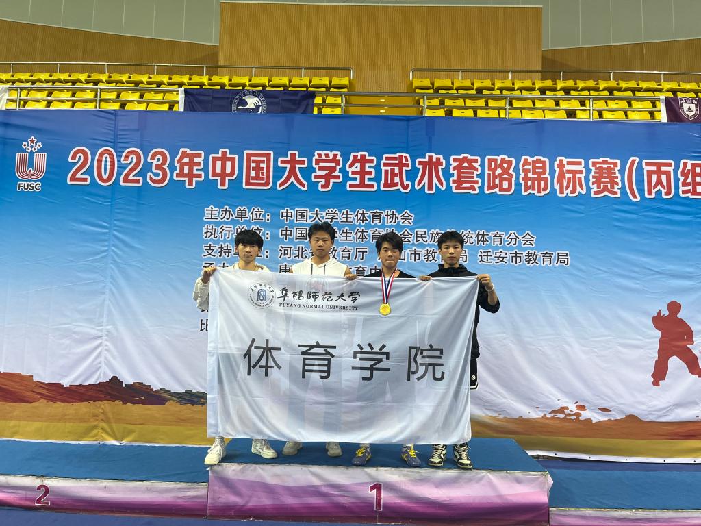 2023年7月12日至16日,由中国大学生体育协会主办,中国大学生体育协会民族传统体育分会执行,唐山九江体育中心承办的2023年中国大学生武术套路锦标赛在河北省迁安市九江体育中心举行,来自北京体育大学、上海大学、浙江大学、复旦大学、澳门大学、香港武术队等55支代表队、近410名大学生运动员参赛。由李俊成、晁钟武、时培舒、沈国彬组成的我校武术代表队参加了高水平组比赛。经过激烈角逐,李俊成同学在男子丙组太极拳八法五步项目中获得金牌,晁钟武同学在男子丙组双器械项目中获得第六名、男子丙组查拳项目中获得第七名。