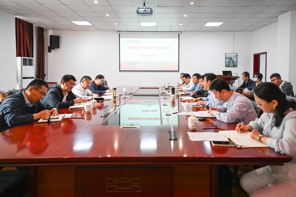 座谈会上,科研处和相关学院负责人分别汇报了校地、校企合作,高峰学科建设情况。
