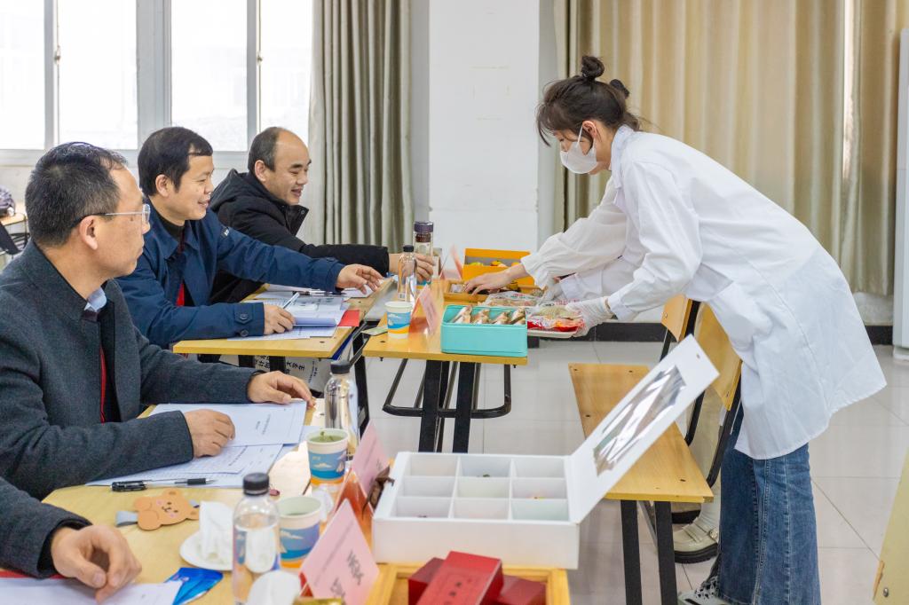 决赛在躬行D楼进行,比赛分为新产品研发、工艺设计(新技术、新工艺)、产品创意(含包装设计、营销策划等)三个组别,八个赛场同时进行,涵盖了各个食品创新领域,如新鲜水果创新、糕点烘焙创新、主食创新等。选手们进行了精彩纷呈的PPT讲解和答辩,他们用扎实的专业知识和流利的口才,向评委们阐述着自己的设计理念和创新亮点以及对于作品未来前景的展望。评委们针对每组产品提出问题和建议,选手们也积极回答并展示自己的创意,现场气氛热烈而紧张。八个赛场都有独立的评委团队,对选手们的作品进行品尝、评比和点评。