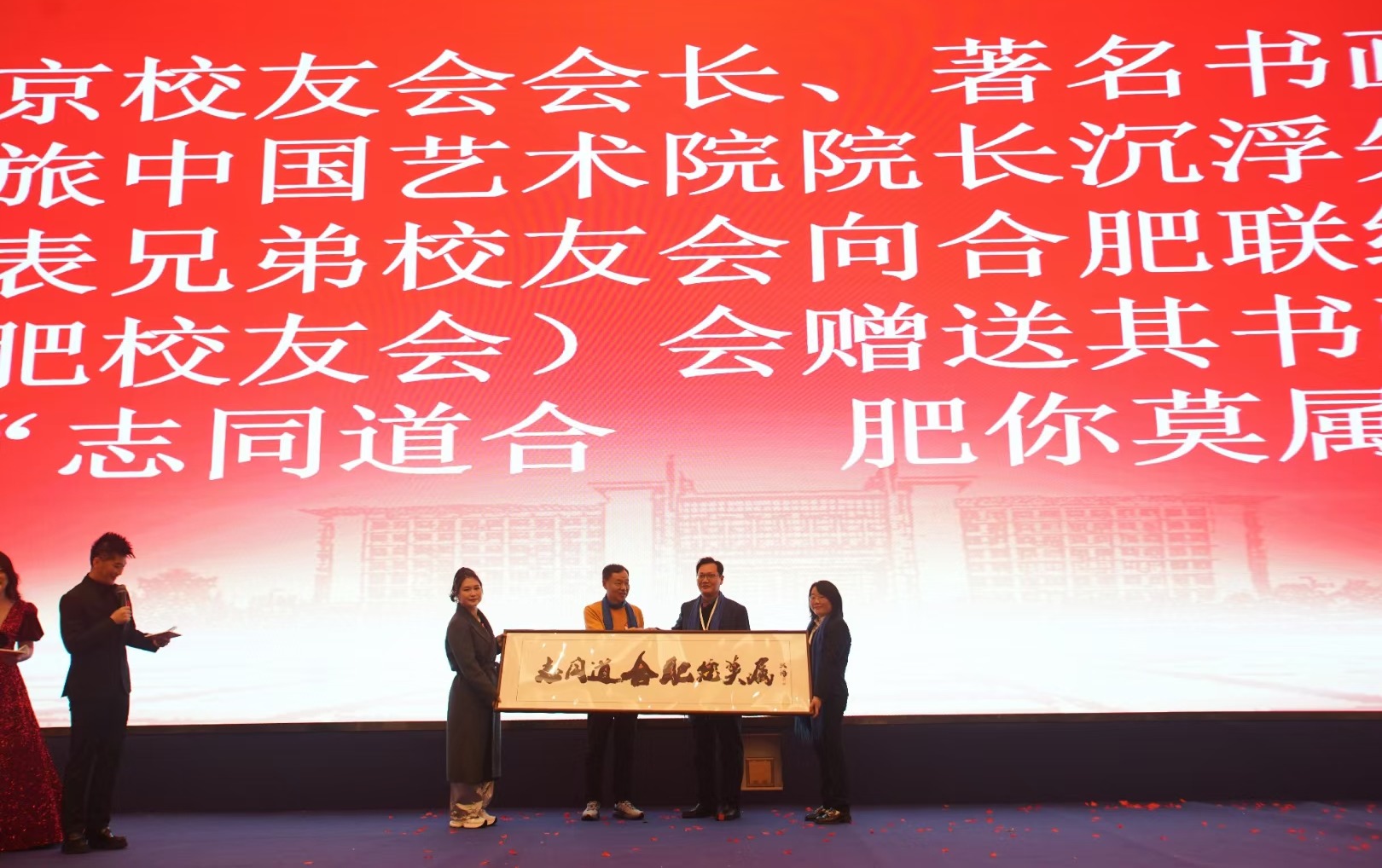 阜阳师范大学校友会副会长、著名书画家、文旅中国艺术院院长沉浮校友代表北京校友联谊会向合肥联络处赠送其书画作品“志同道合 肥你莫属”。
