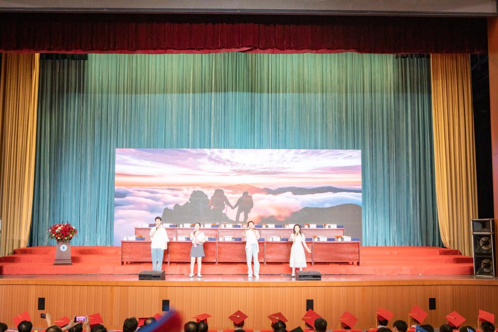 开场为暖场视频播放和师生暖场演唱。一帧帧同学们在校学习、生活、实践等场景的珍贵时光画面,表达了母校对学生的依依不舍之情和学生对母校的祝福与感谢。辅导员李阳、董力纬携手优秀毕业生代表孔瑜清、十佳校园歌手孙庭宣深情演唱了优美的歌曲,以此表达难忘的师生情、同学情,同时又蕴含着对未来的期望与憧憬。