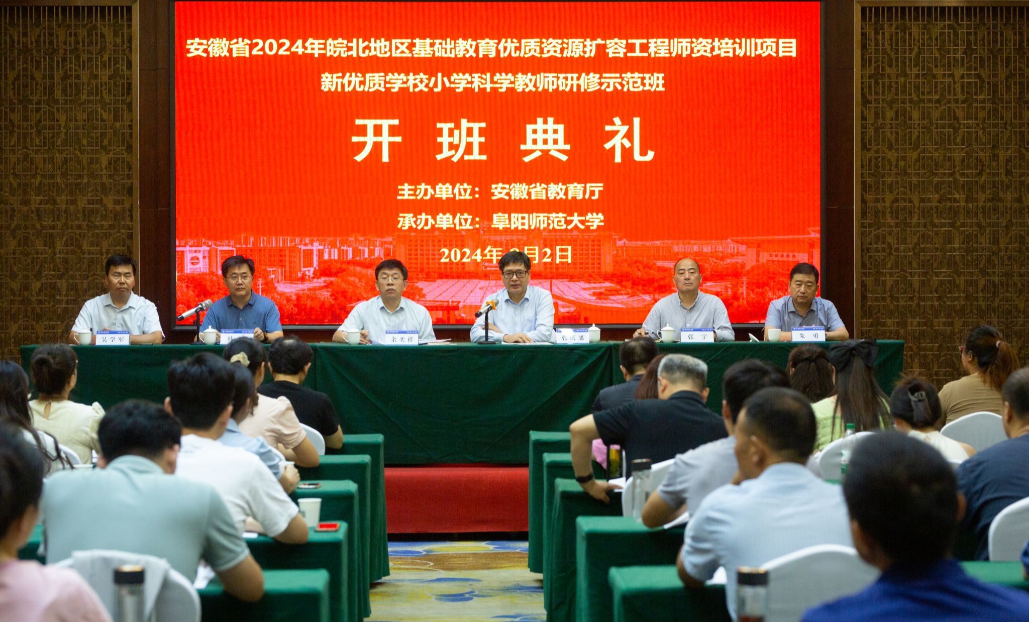 8月2日上午,安徽省2024年皖北基础教育优质资源扩容工程师资培训项目新优质学校小学科学教师研修示范培训班在阜阳广润国际大酒店举行开班典礼。省教育厅师资处处长余奕祥、副处长韩光,我校党委常委、副校长张庆旭出席开班式,继续教育学院、物理与电子工程学院等单位有关负责人以及来自皖北39所新优质小学的科学教师学员参加了开班仪式。开幕式由韩光主持。