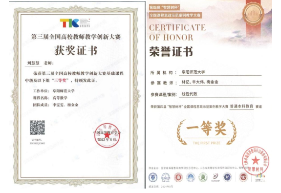 第一次党代会以来,数学与统计学院先后获“教育实习先进单位”“专业实习先进单位”“课程思政建设成效突出单位”“教师教学创新大赛先进单位”“学科竞赛先进单位”“智慧课堂教学先进单位”“考研先进单位”“就业工作先进单位”“征兵工作先进单位” 和“大学生职业规划大赛优秀组织单位”等荣誉称号。