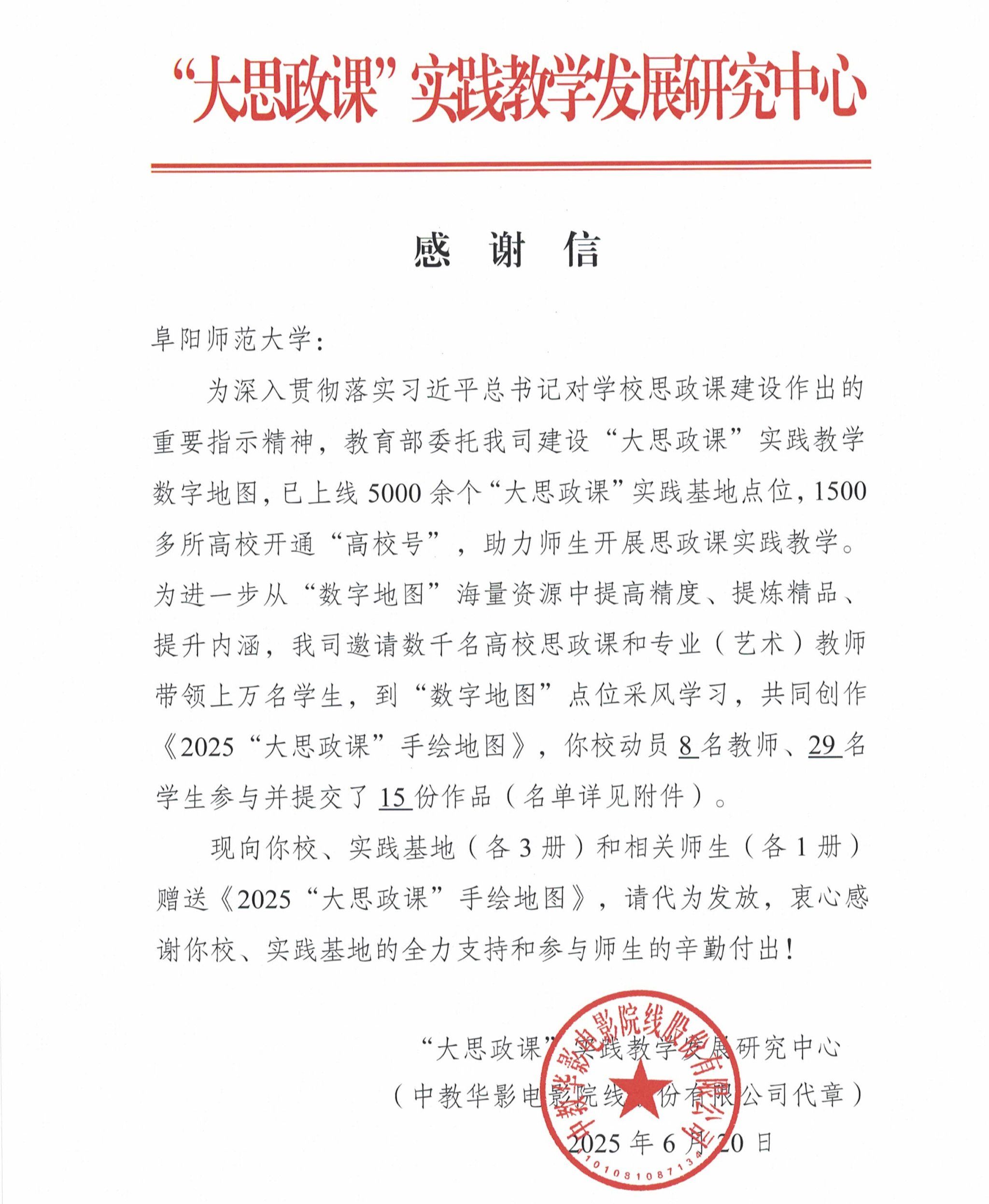 学校党政高度重视作品创作,对创作团队全程跟踪指导,创作团队多次奔赴一线,围绕王家坝精神等内容,生动讲述蒙洼人民“舍小家、为大家”的动人故事。据悉,该“大思政课”手绘地图项目思政实践教学资源已上传至教育部大思政课实践教学数字地图平台,并面向全国展播。