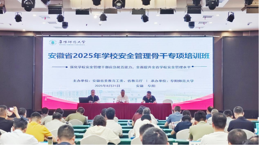 8月20日上午,安徽省2025年学校安全管理骨干专项培训班开班仪式在我校西湖校区举行。本次培训由安徽省教育厅主办,阜阳师范大学承办,旨在深入贯彻习近平总书记关于校园安全的重要指示精神,全面提升全省学校安全风险防控与应急处置能力,为千万师生筑牢校园安全屏障。安徽省教育厅学校安全管理处处长、一级调研员储修杰,我校党委常委、副校长卢少求出席开班仪式。各市、县(市、区)教育局分管负责人、中小学校长、幼儿园园长及省学校安全生产专项领导小组成员单位部门负责人、我校安全管理处(党委保卫部)负责人等参加培训。开班仪式由校继续教育学院院长、安徽省干部教育培训阜阳师范大学基地办公室主任王健主持。
