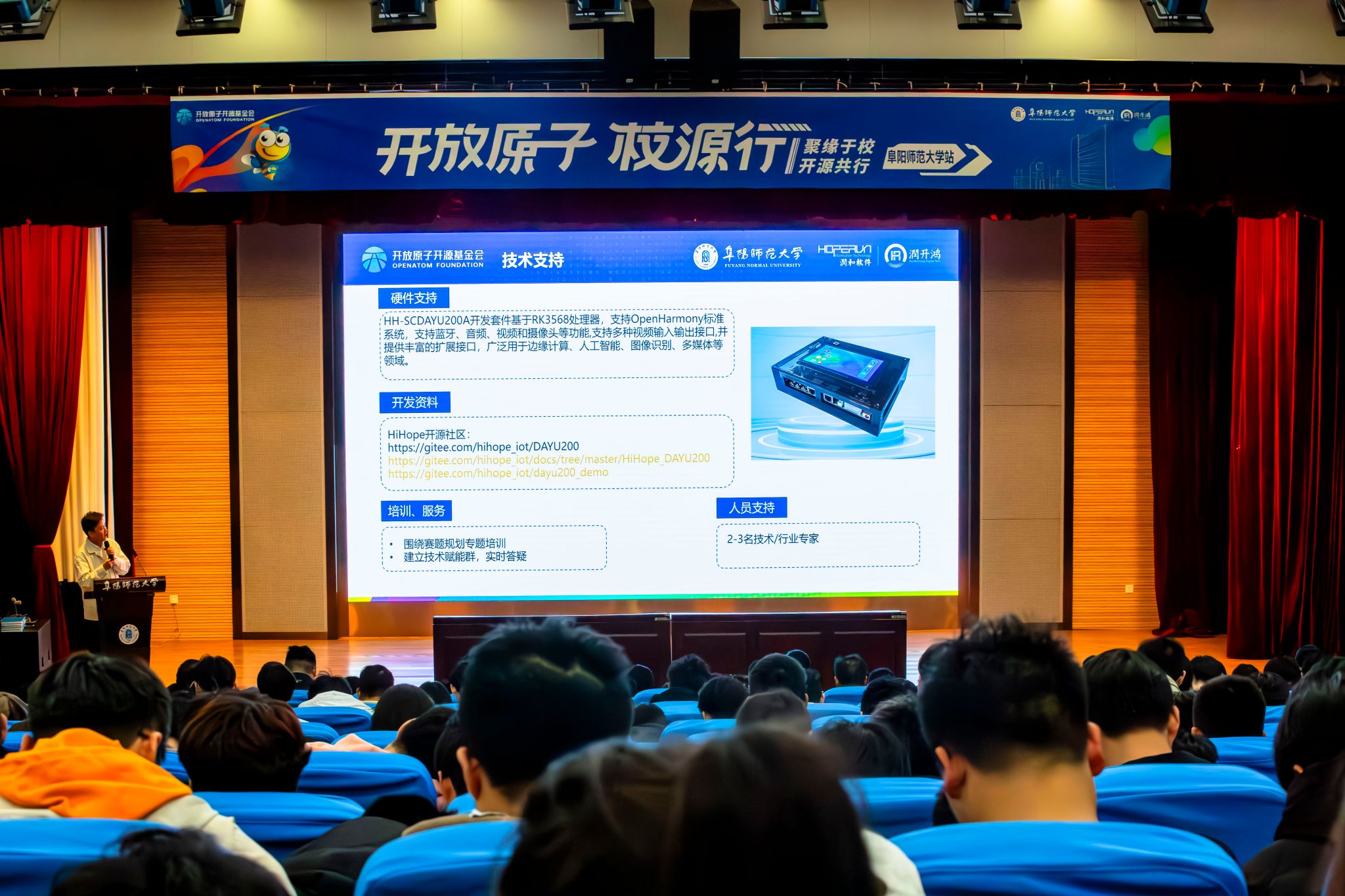 10月29日,“开放原子校源行”线下活动在西湖校区正行楼二楼报告厅举办。活动由开放原子开源基金会主办,我校联合江苏润开鸿数字科技有限公司、安徽省智能计算与信创应用工程研究中心承办,腾讯公司为战略合作单位。校党委常委、副校长王诗兵出席活动并致辞,开放原子开源基金会教育培训部负责人韩江,江苏润和软件股份有限公司副总裁、开源生态运营官丽娜等单位负责人参加会议,线下参会师生近400人。大会由我校计算机与信息工程学院院长王先超主持。